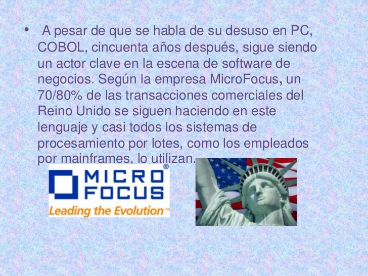 - Próximo a su cincuenta cumpleaños, el lenguaje COBOL (Lenguaje Común Orientado a Negocios) continúa en plena forma según los últimos datos estadísticos, a pesar de su reemplazo en PCs por sistemas de programación visuales. Presente en mainframes, un 32% de las compañías todavía utilizan COBOL para desarrollo y mantenimiento y hasta un 80% de transacciones comerciales en el Reino Unido siguen basadas en este lenguaje.